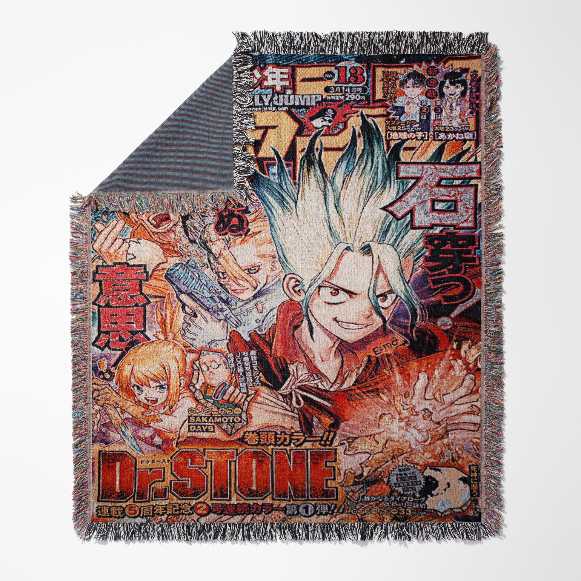 Step into the Stone World with this electrifying Dr. STONE tapestry blanket, inspired by the iconic Weekly Shonen Jump magazine cover. Featuring a bold and brilliant print of Senku Ishigami and key characters from the hit anime and manga series, this woven throw fuses science, survival, and style into one unforgettable piece of decor.